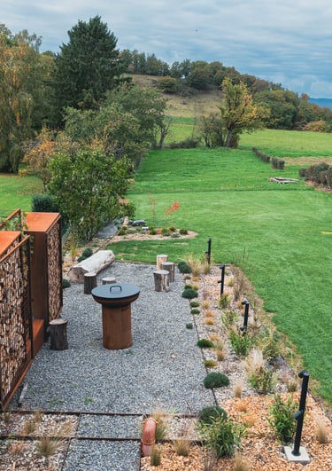 Sauna privatif, bain nordique chauffé au bois, calme absolu et vue dégagée sur la nature.